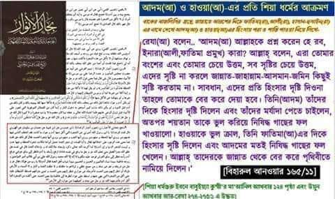 সাবাঈ শিয়া ধর্ম শুধু আলী রা, হাসান রা, হোসাইন রা সহ সাহাবীদের নামে মিথ্যাচার করে ক্ষান্ত হয়নি, আল্লাহ্ ও নবী-রাসূলদের প্রতিও হাত বাড়িয়েছে। শিয়া যাজক বাকের মাজলিসির ধর্মগ্রন্থে, জান্নাতে আরশের নিচে ফাতিমা(রা),আলী(রা), হাসান-হুসাইন (রা) এর নামে দেখে আদম (আ) ও হাওয়া (আ) এর হিংসায় পরা ও শাস্তি পাওয়া নিয়ে লিখে-