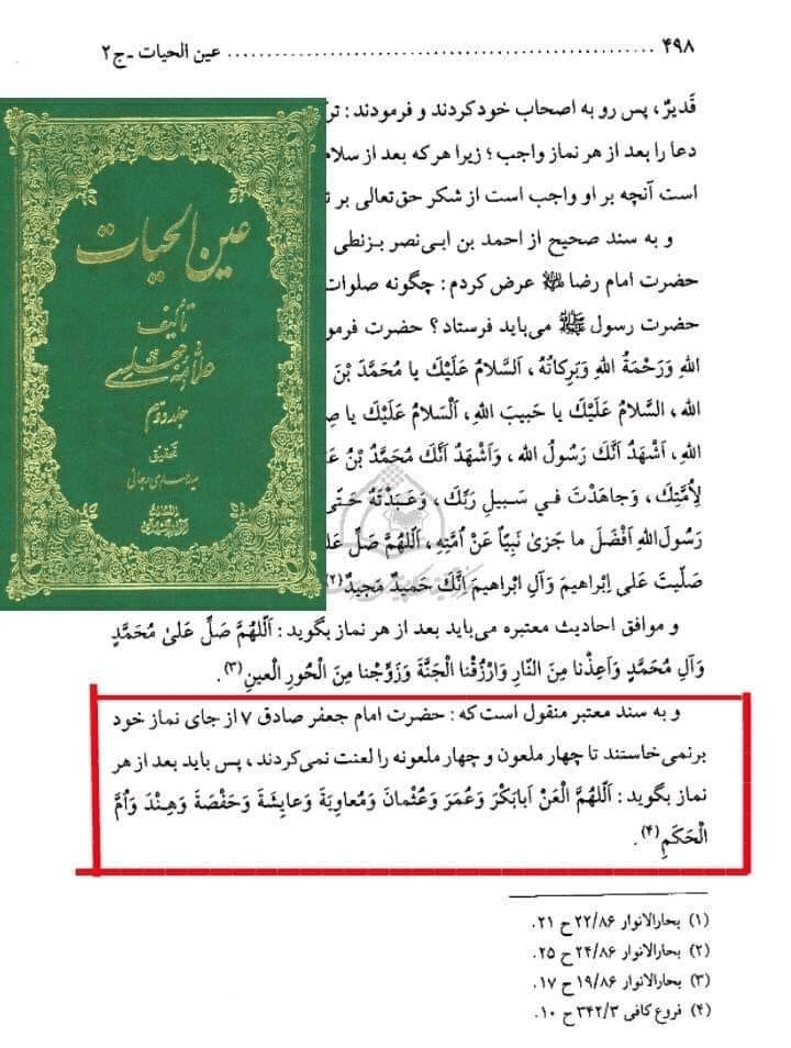 সে লিখেছে: “গ্রহনযোগ্য সূত্রে বর্ণিত হয়েছে যে, হযরত ইমাম জাফর সাদেক আ. নিজ জায়নামাজ থেকে উঠতেন না, যতক্ষন পর্যন্ত চার অভশপ্ত পুরুষ ও চার অভিশপ্ত নারীকে অভিসম্পাত না করতেন! সুতরাং তিনি প্রত্যেক নামাজের পরে বলতেন,