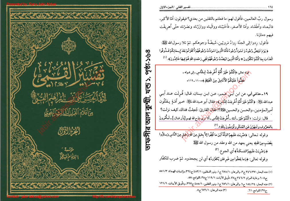 আবিল হাসান আলী বিন ইবরাহিম আল কুম্মী আর রাফেজী তার লিখিত তাফসীর ‘তাফসীর আল কুম্মী’-এ পবিত্র কোরআনের সূরা আল ইমরানের ১০ নং আয়াত [তোমরাই হলে সর্বোত্তম উম্মত,যাদেরকে মানুষের জন্য বের করা হয়েছে। তোমরা ভাল কাজের আদেশ দেবে এবং মন্দ কাজ থেকে বারণ করবে, আর আল্লাহর প্রতি ঈমান পোষণ করবে। আর যদি আহলে কিতাব ঈমান আনত, তবে অবশ্যই তা তাদের জন্য কল্যাণকর হত। তাদের কতক ঈমানদার। তাদের অধিকাংশই ফাসিক। ] এর ব্যাখ্যায় একটি হাদীস উল্লেখ করেছেন। চলুন হাদীসটি দেখে আসি।