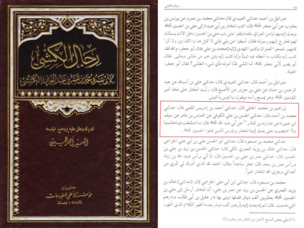 ((এটি কাশি-র রিজাল নামক গ্রন্থের ব্যক্তিগত কপি থেকে সংগৃহীত, বৈরুত: মুয়াসসাসাহ আমালি লিল মাতবু’আত, প্রথম সংস্করণ, ১৪৩০ হিজরি, পৃষ্ঠা ৯৭))