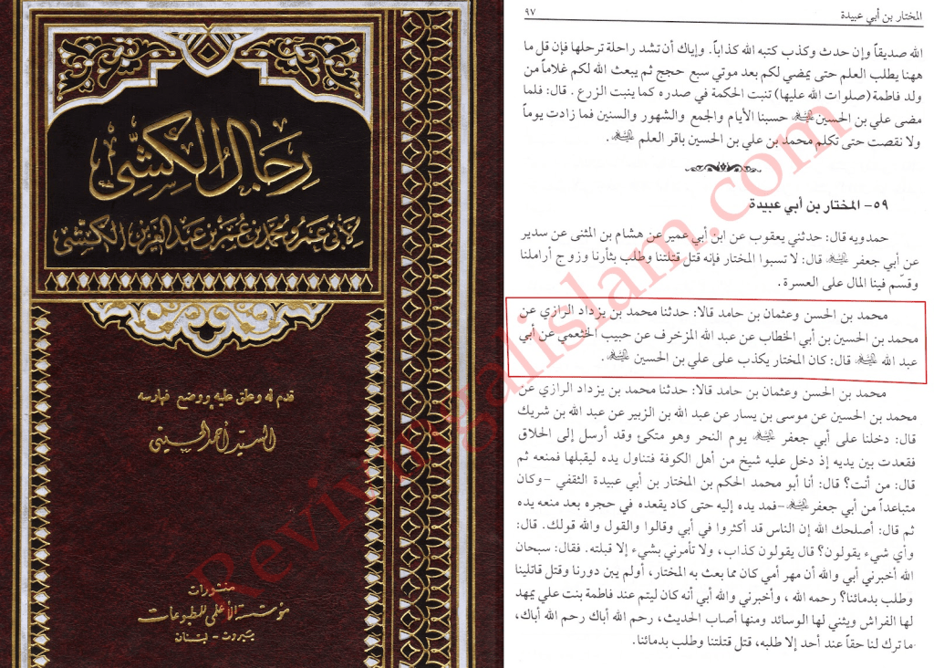 محمد بن الحسن و عثمان بن حامد، قالا حدثنا محمد بن يزداد الرازي، عن محمد بن الحسين بن أبي الخطاب، عن عبد الله المزخرف، عن حبيب الخثعمي، عن أبي عبد الله (ع) قال كان المختار يكذب على علي بن الحسين (عليهما السلام